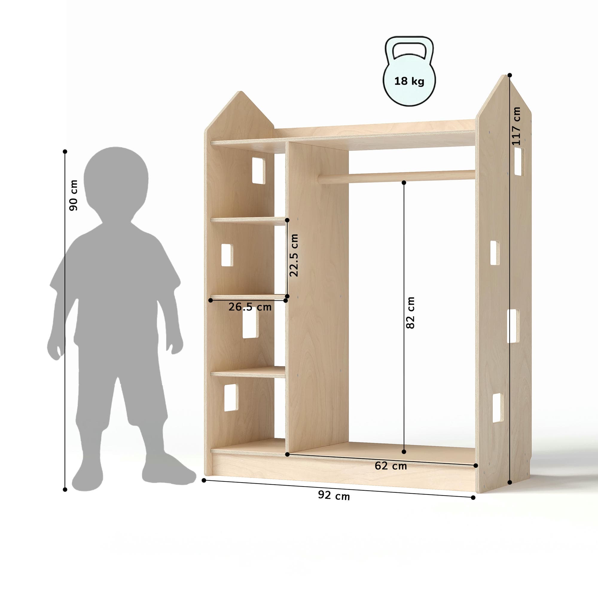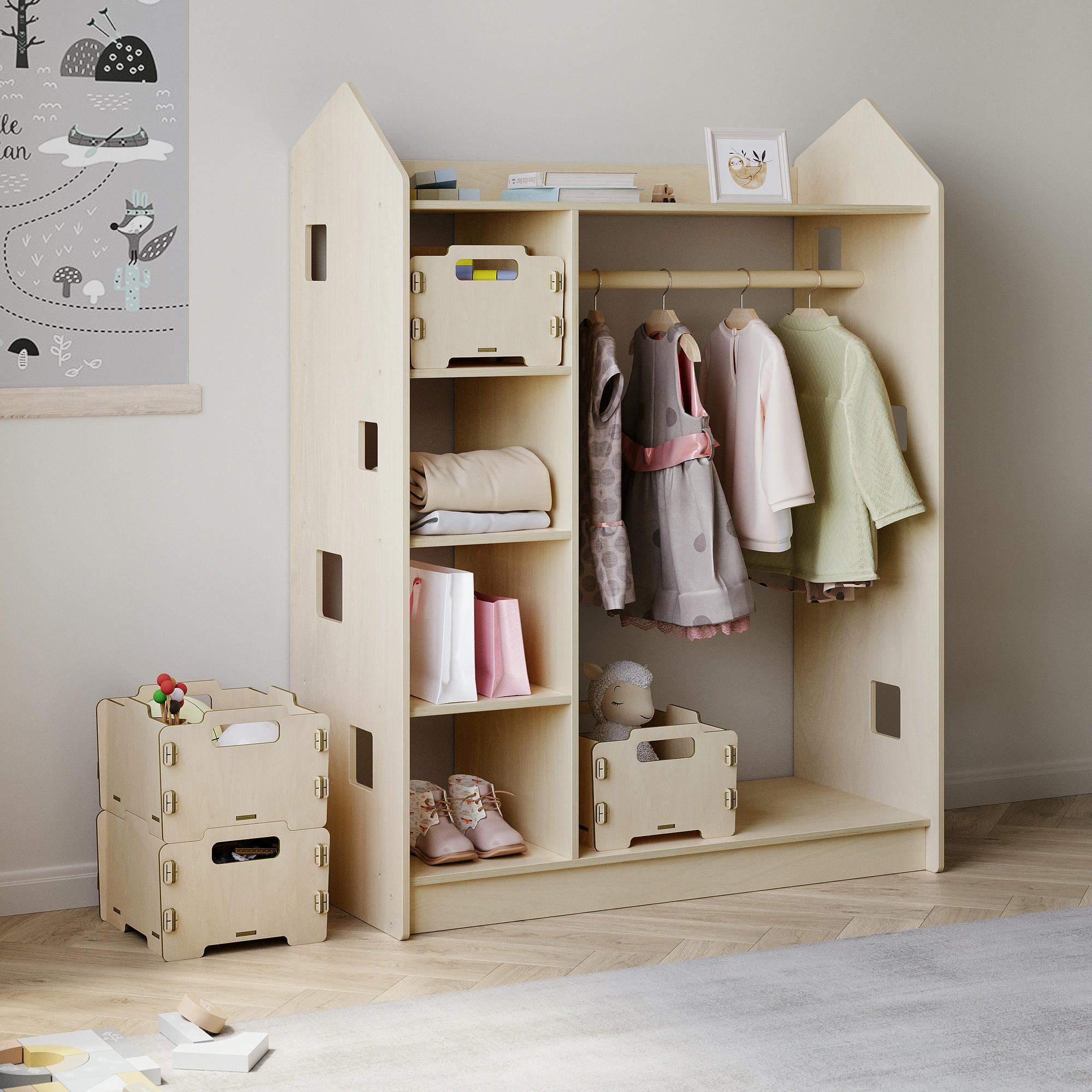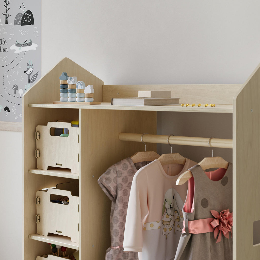 Le presentamos una solución funcional para el almacenamiento eficaz y la organización de la ropa: un armario infantil único en forma de casita que complementará nuestros best-sellers existentes: las estanterías de juguetes y libros de la misma colección.