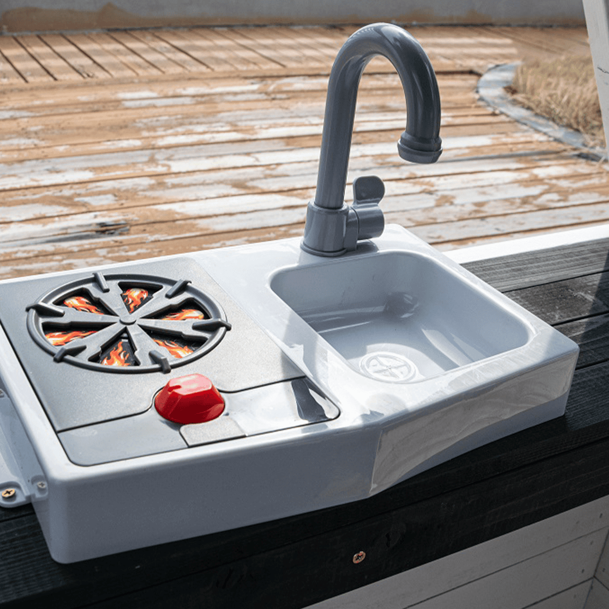 En la acogedora cocina de juego se encuentran una placa de cocción con mando rojo giratorio, un fregadero y utensilios básicos, para que los pequeños cocineros puedan preparar deliciosos platos para amigos o padres. Otros extras incluyen un reloj, jardineras a los lados de la puerta de entrada y una práctica entrada para perro, cubierta con una cortina de tela con motivo de caseta de perro. La casa está fabricada en madera y pintada en colores naturales, lo que la convierte en un complemento decorativo para cualquier jardín o pequeño espacio exterior.