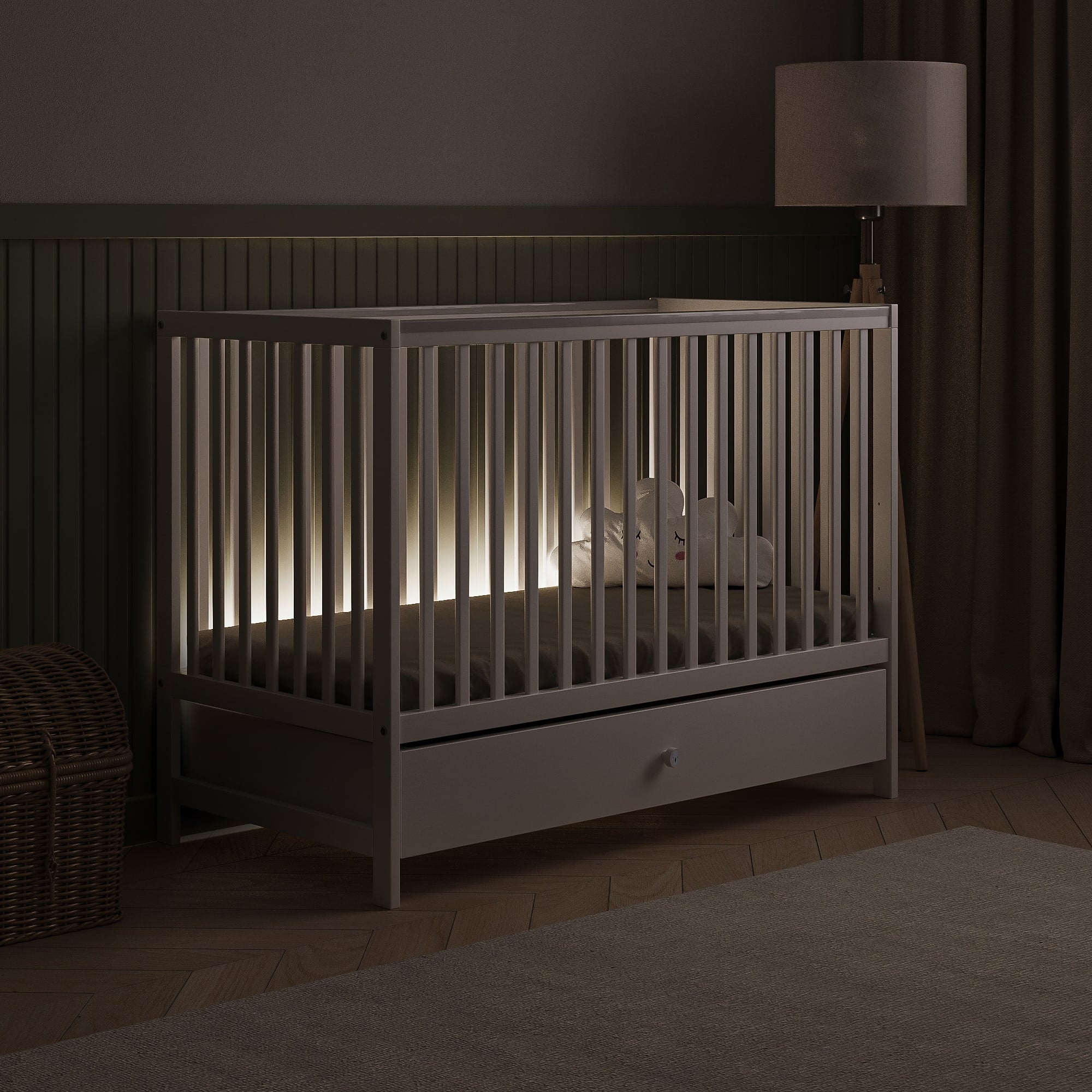 El cajón, montado sobre guías de rodillo, está fabricado con panel laminado resistente a los arañazos y muy duradero. Los barrotes están hechos de madera maciza de pino y recubiertos con una pintura segura y libre de sustancias tóxicas. El somier, lijado y sin tratar, está elaborado en haya y pino, con un acabado exterior blanco que armoniza perfectamente con el diseño general de la cama.
