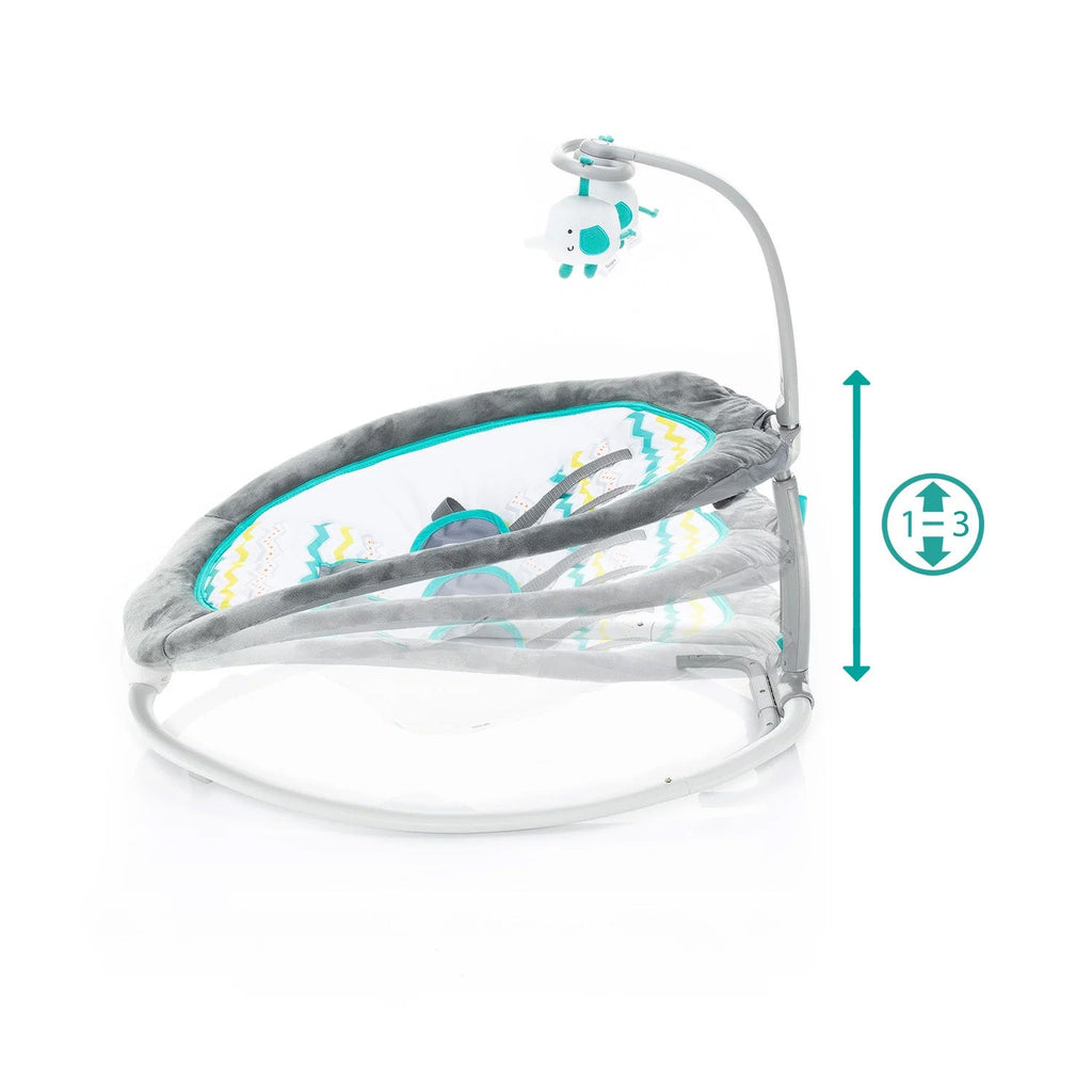 El acolchado suave, fabricado con materiales agradables y transpirables, garantiza un confort óptimo para el niño. El respaldo se puede ajustar en 4 posiciones diferentes. La hamaca cuenta con función relajante con vibración y un mecanismo musical con varias melodías, cuyo volumen se puede regular. La barra de juegos desmontable con peluches también entretiene al niño.