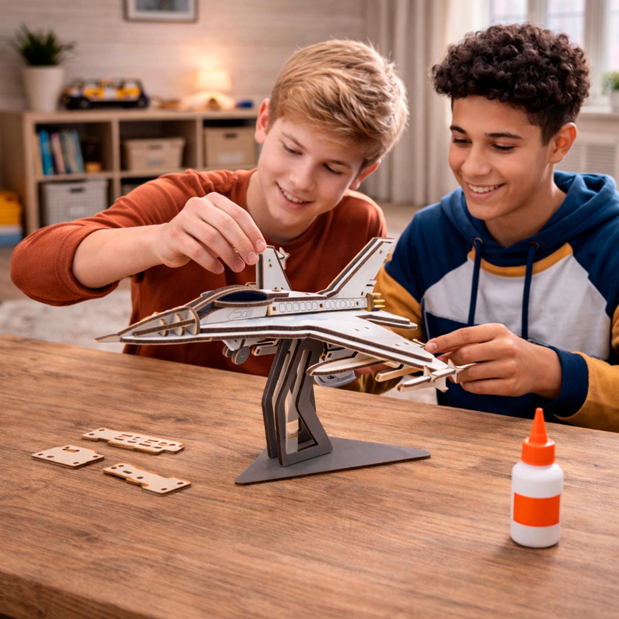 Ofrece a un adolescente una experiencia de construcción envolvente con la maqueta 3D de madera Avión de combate de BusyKids. Este kit permite ensamblar de forma autónoma un impresionante modelo tridimensional y es una excelente opción para todos aquellos que se interesan por la técnica, la aviación y el modelismo creativo.