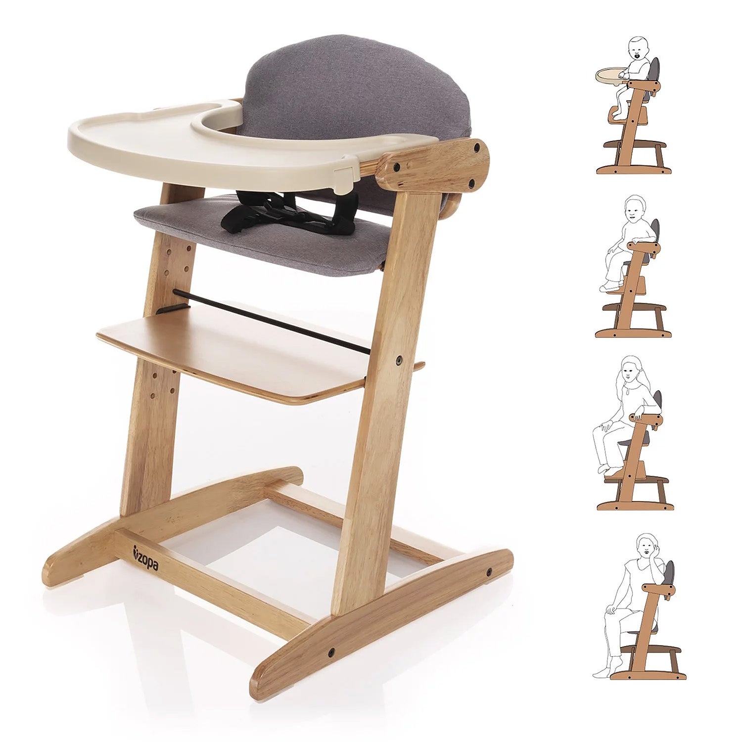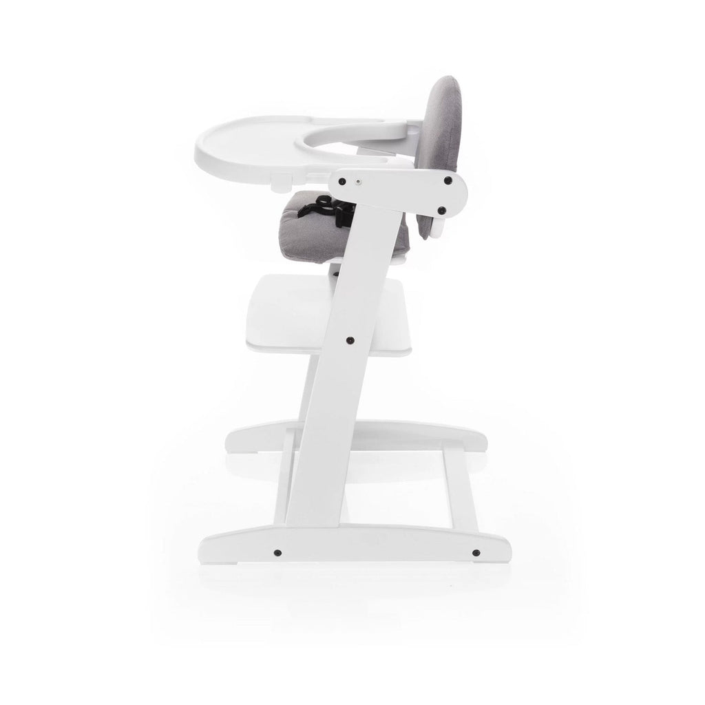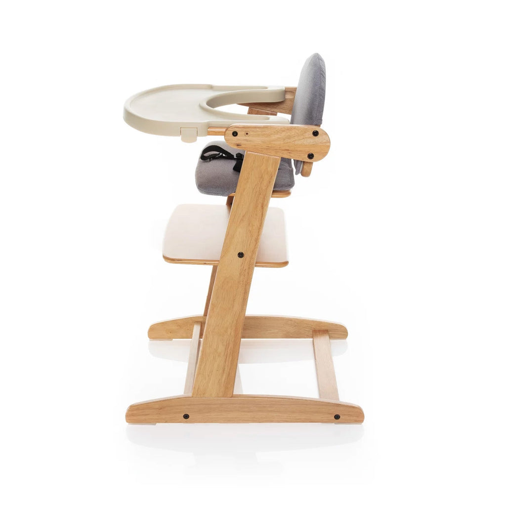 La estructura sólida de madera de alta calidad asegura una gran durabilidad. Para una máxima seguridad durante las comidas, el acolchado cuenta con un arnés de seguridad de 5 puntos.